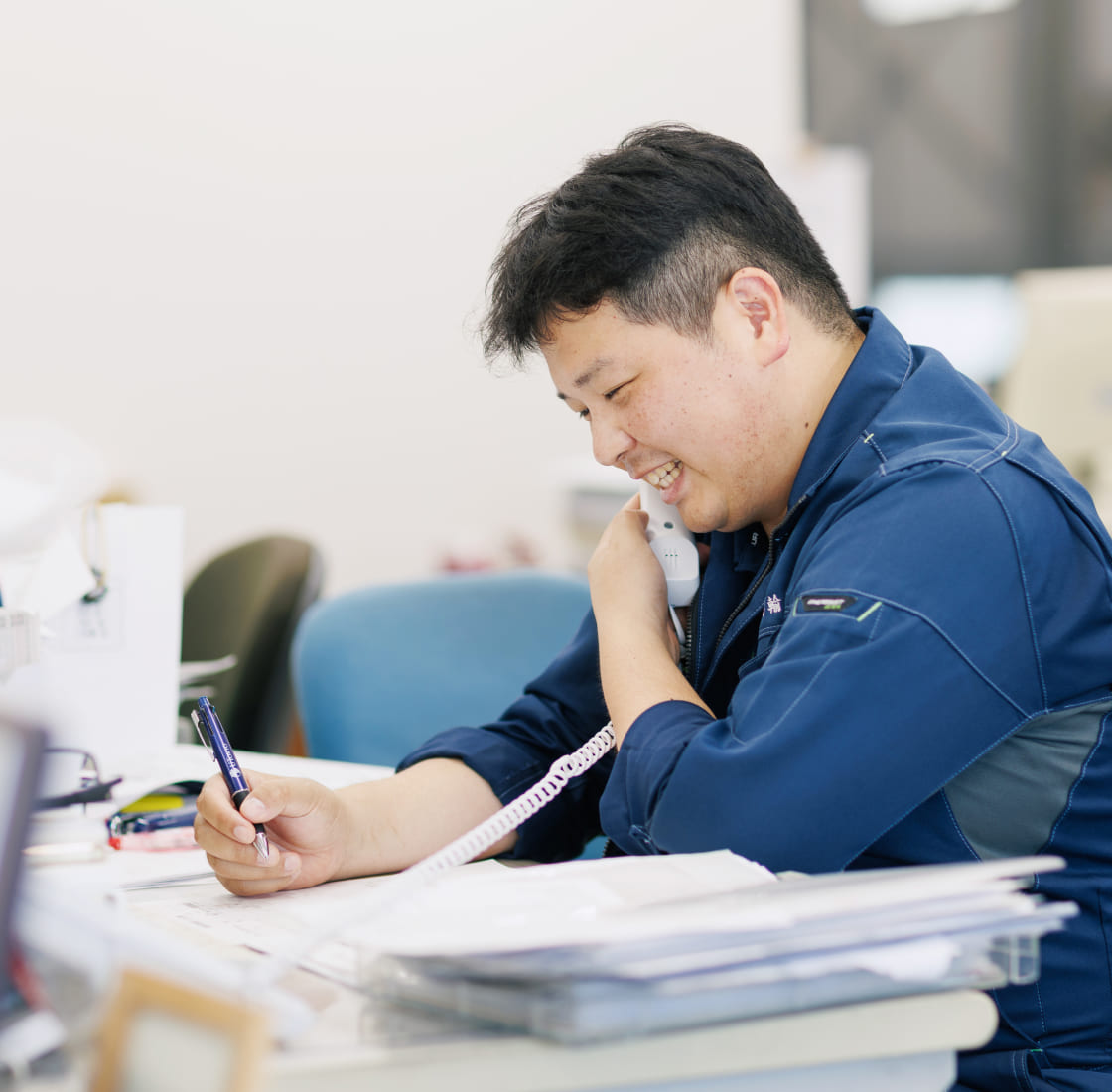 - お客様からいただいた依頼を各トラックに振り分け、スケジュール調整を行う仕事です。 会社で対応しきれない案件は、グループ会社や協力会社に声をかけて調整することもあります。電話対応やメール確認など、外出せず常に連絡を取れる体制を整えるよう心がけています。社内外の調整役なので、一つの遅れが全体に響く。その緊張感がやりがいでもあります。